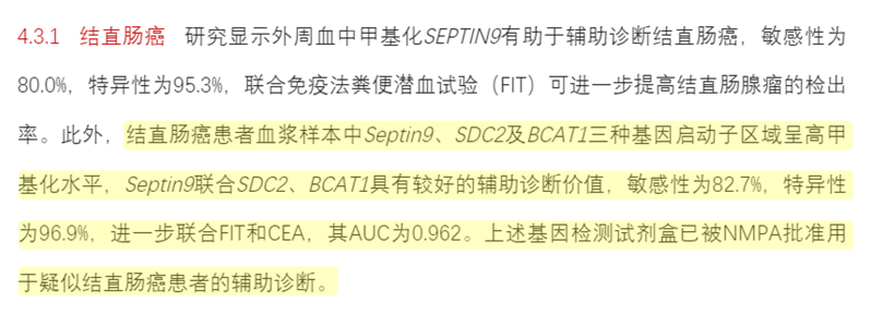 《肿瘤 DNA 甲基化标志物检测及临床应用专家共识(2024 版)》明确:外周血甲基化检测(如 Septin9 基因)对结直肠癌的敏感性和特异性表现优异,若联合 Septin9、SDC2、BCAT1 三个基因检测,准确性还能进一步提升,联合其他筛查手段后诊断效能更突出;