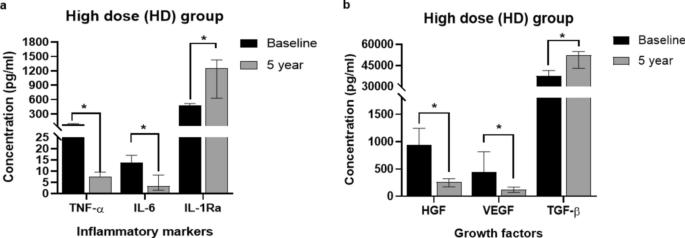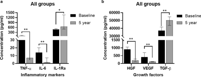 ↑ 比较基线和5年随访的所有(n=11)组的炎症标志物(a)和生长因子(b)水平